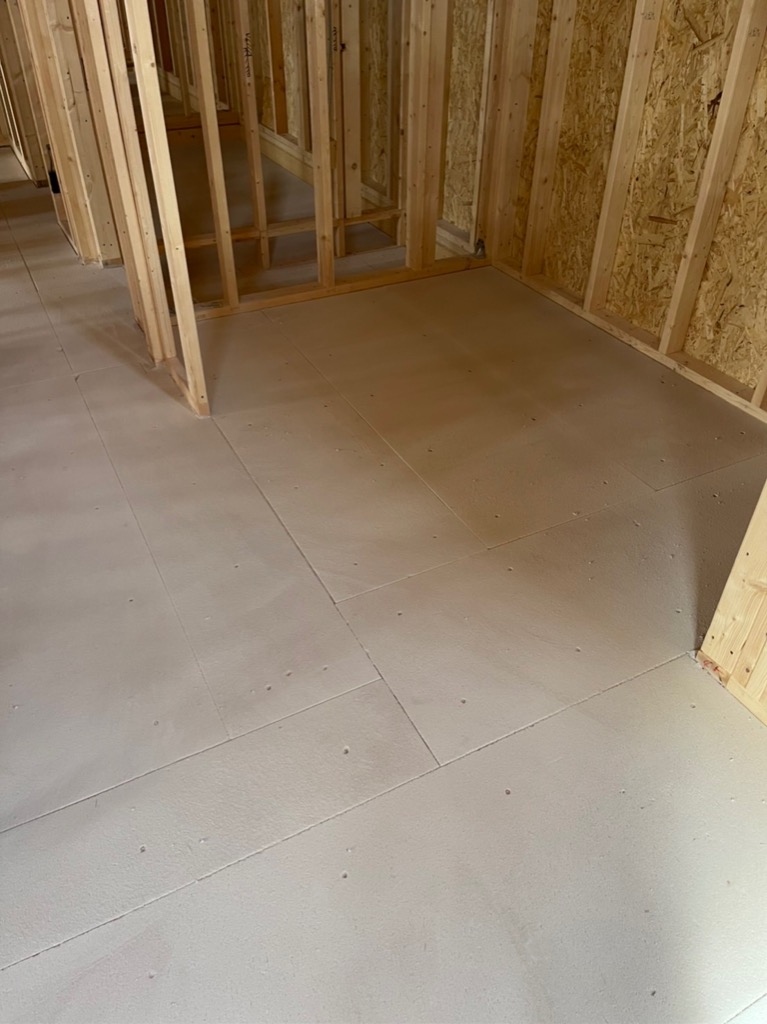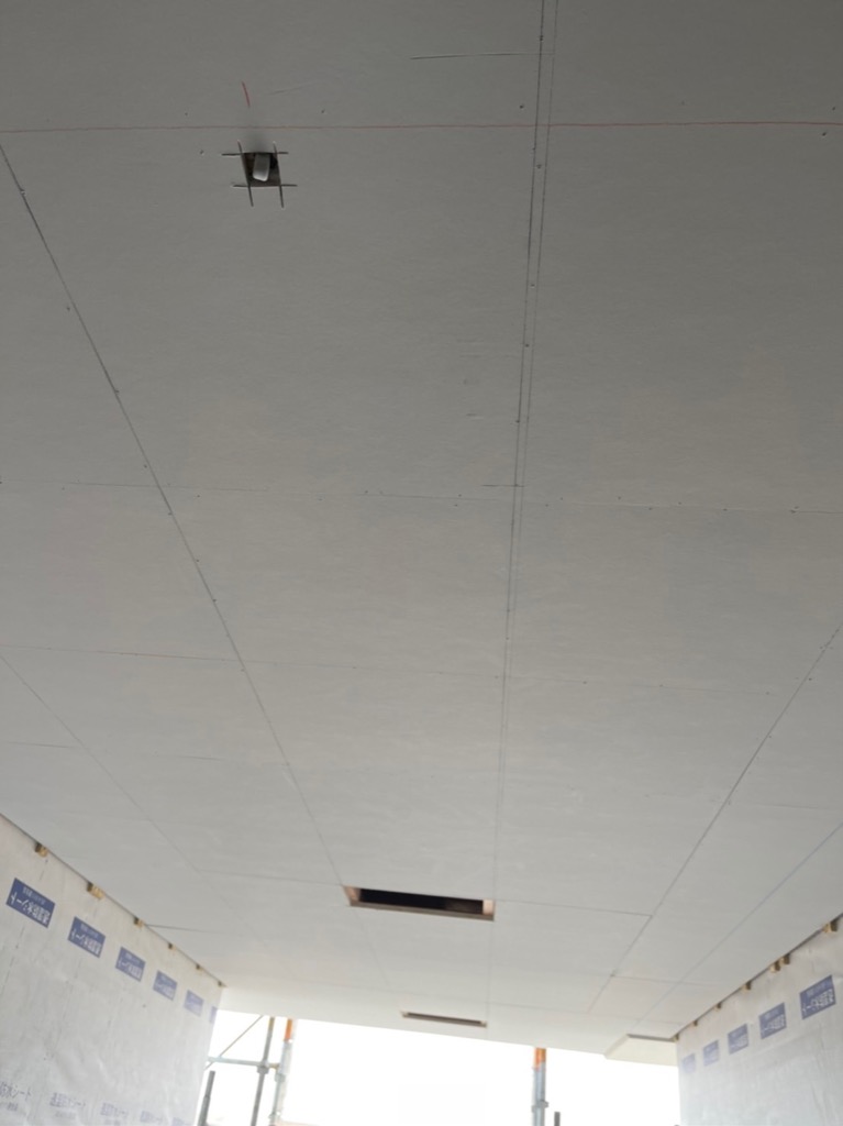 草津市木造建築で、軒天井にケイカル板8ミリを2重に貼っていきました。その上からサイディングを貼ってできあがりです。耐火構造施工です。